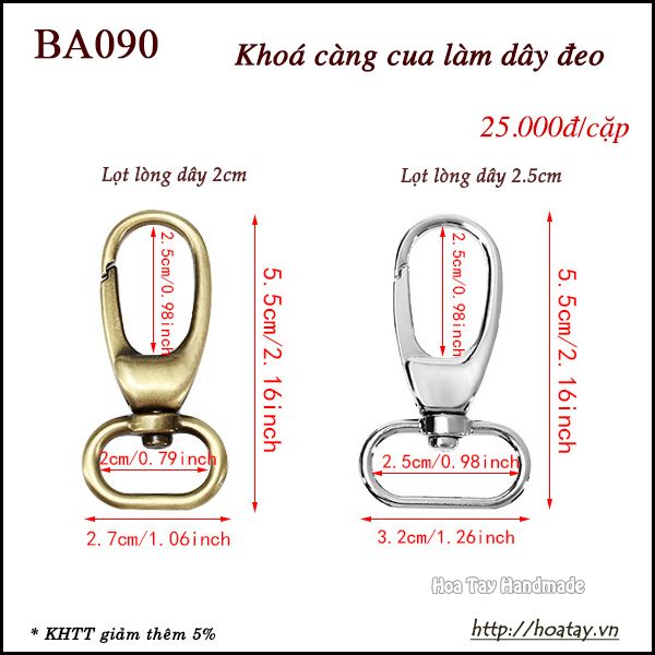 Khoá càng cua dùng làm dây đeo, lọt lòng dây 2cm và 2.5cm. Giá bán theo cặp