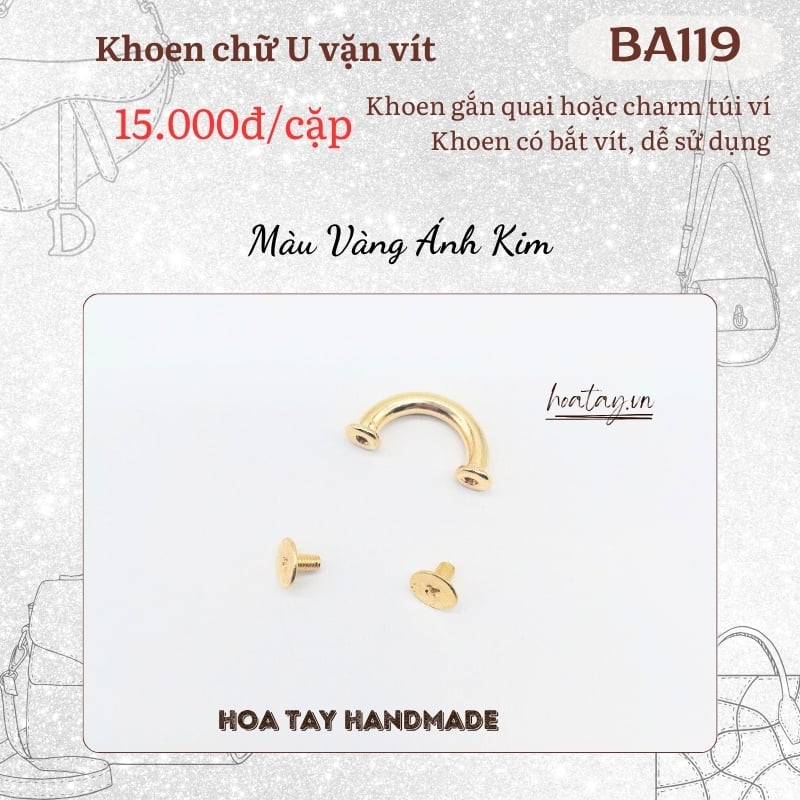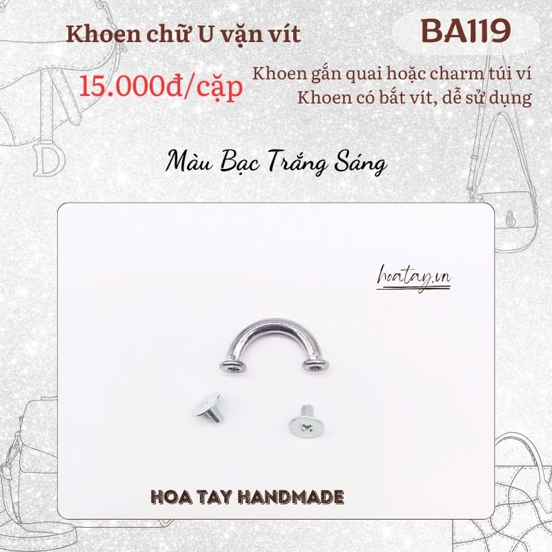 Khoen chữ U vặn vít BA119 được dùng phổ biến trong ngành thủ công, làm túi ví, balo, clutch hoặc charm trang trí. Nhờ thiết kế tiện lợi, khoen giúp gắn quai da, dây xích hoặc charm kim loại một cách chắc chắn và thẩm mỹ. Đây là lựa chọn lý tưởng cho những ai muốn tự tay sáng tạo, sửa chữa hoặc nâng cấp phụ kiện túi ví của mình, mang lại vẻ đẹp tinh tế và chuyên nghiệp cho sản phẩm handmade.