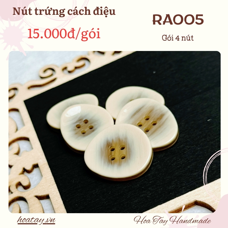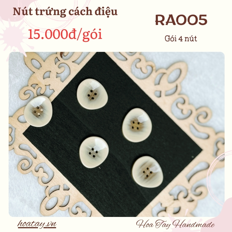 Giá bán hợp lý với chỉ 15.000đ cho mỗi gói 4 nút, sản phẩm RA005 chắc chắn sẽ là lựa chọn lý tưởng cho các tín đồ thủ công mỹ nghệ.